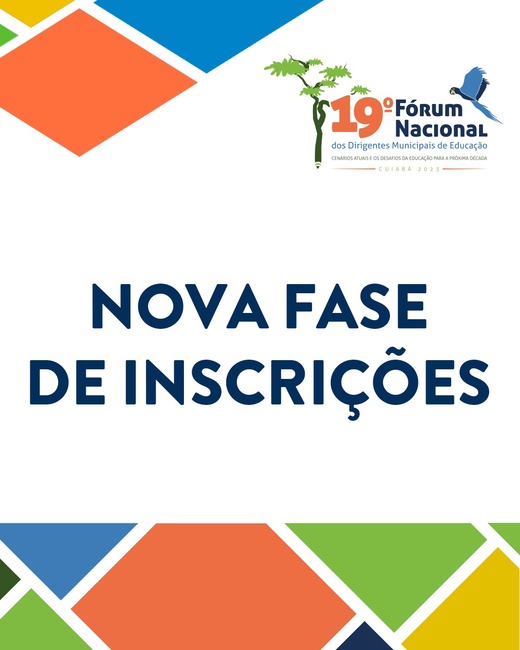 Está oficialmente aberto o novo lote de inscrições do 19º Fórum Nacional dos Dirigentes Municipais de Educação. O evento será realizado de 6 a 9 de agosto, em Cuiabá/ MT, no Centro de Eventos do Pantanal e terá como temática central os cenários atuais e os desafios da educação para a próxima década.