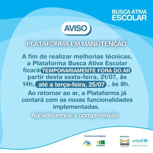 A fim de realizar melhorias técnicas, a Plataforma Busca Ativa Escolar ficará temporariamente indisponível a partir desta sexta-feira, 21/07, às 14h, até a terça-feira, 25/07, às 8h.