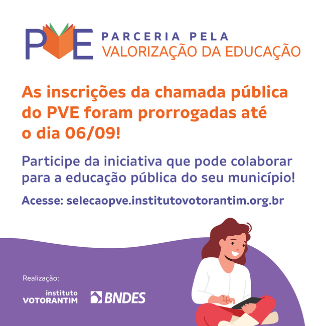 O Instituto Votorantim e o BNDES (Banco Nacional de Desenvolvimento Econômico e Social) decidiram prorrogar o período de inscrições no programa Parceria pela Valorização da Educação (PVE). Agora, os municípios terão até o dia 6 de setembro para se candidatar através do site: https://selecaopve.institutovotorantim.org.br/.