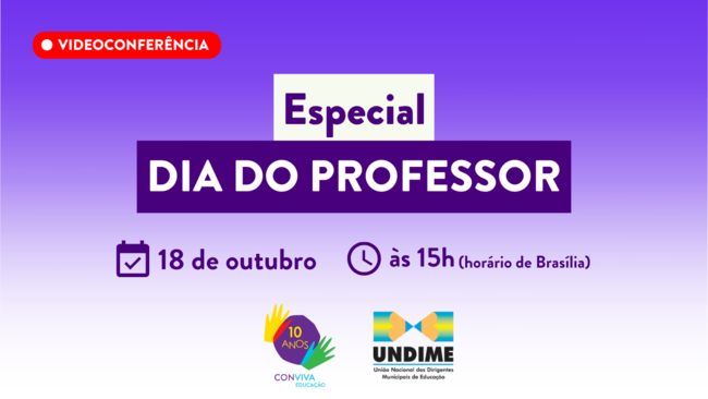 Para celebrar o dia dos(as) professores(as) a Undime, por meio da plataforma Conviva Educação, realiza nesta quarta-feira, dia 18 de outubro, às 15h (horário de Brasília), a videoconferência "Professor... PRESENTE!!!", com a educadora e psicóloga Thereza Penna Firme.