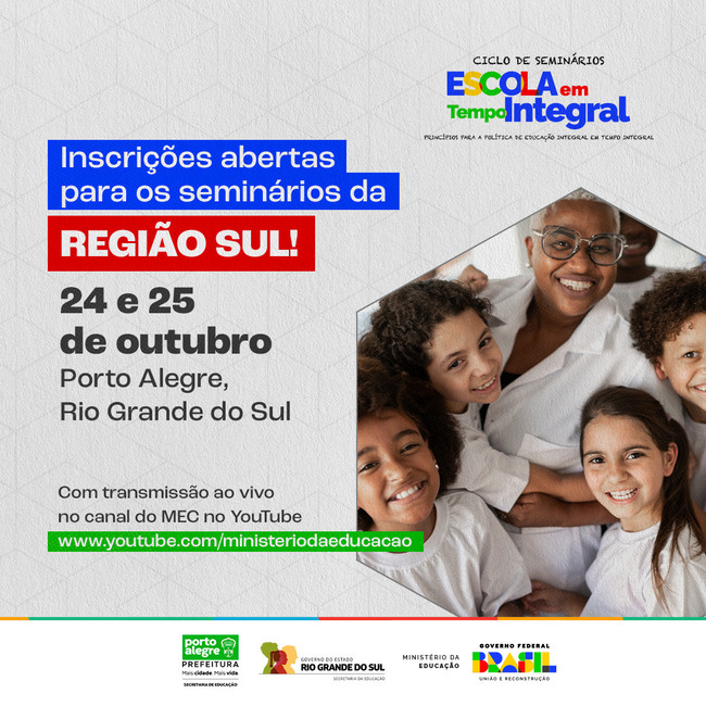 O Ministério da Educação (MEC) está com as inscrições abertas para a etapa da Região Sul do Ciclo de Seminários Programa Escola em Tempo Integral: Princípios para a Política de Educação Integral em Tempo Integral. O evento ocorrerá nos dias 24 e 25 de outubro, no Auditório Mondercil Paulo de Moraes do Ministério Público, em Porto Alegre/RS, das 9h às 18h (horário de Brasília).