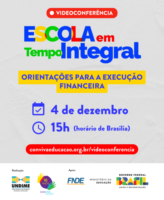 Para dar orientações quanto ao uso dos recursos, o Conviva Educação realizará videoconferência, no dia 4 de dezembro, segunda-feira, às 15h (horário de Brasília), com a coordenadora-geral de Educação Integral e Tempo Integral do Ministério da Educação, Raquel Franzim; e André Luís Fernandes, coordenador-geral de Bolsas e Auxílios do Fundo Nacional de Desenvolvimento da Educação. A mediação será feita pelo presidente nacional da Undime, Alessio Costa Lima, Dirigente Municipal de Educação de Ibaretama/CE.