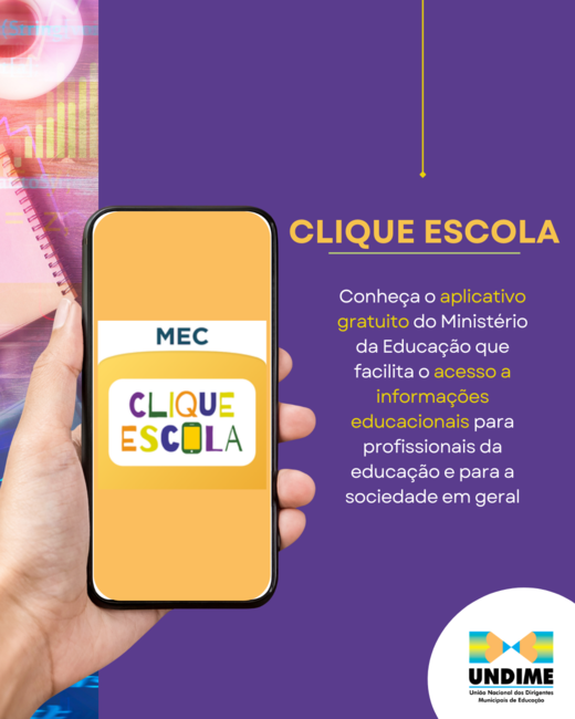 O aplicativo Clique Escola é uma inciativa da Secretaria de Educação Básica do Ministério da Educação (SEB/MEC) e está à disposição para ser baixado gratuitamente por meio das lojas de aplicativos para celular. O intuito do aplicativo é facilitar o acesso a informações educacionais para profissionais da educação e para a sociedade em geral. Isso porque, o acesso ágil a informações consistentes é crucial nos dias atuais e desempenha um papel fundamental na tomada de decisões, especialmente no contexto da gestão escolar.