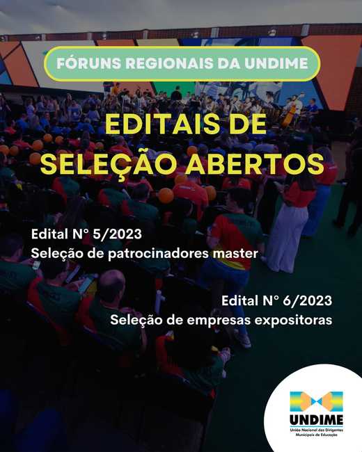 Nesta terça-feira, 12 de dezembro, a União Nacional dos Dirigentes Municipais de Educação (Undime) torna público os editais para seleção de empresas para patrocínio e interessadas em expor tecnologias e produtos inerentes à área da educação de nos Fóruns Regionais dos Dirigentes Municipais de Educação, que serão realizados nos meses de março, abril, maio e junho de 2024, um em cada uma das cinco regiões geográficas do Brasil.