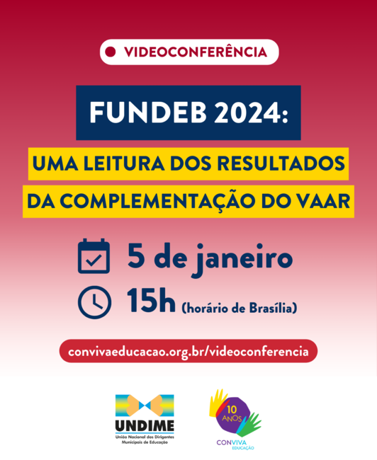 Nesta sexta-feira, 5 de janeiro, às 15h (horário de Brasília), a Undime por meio do Conviva Educação realizará videoconferência para tratar do Fundeb 2024. Representantes do Ministério da Educação e do Instituto Nacional de Estudos e Pesquisas Educacionais Anísio Teixeira (Inep) estarão no estúdio de TV da Undime, em Brasília, e vão fazer uma leitura dos resultados da complementação do VAAR. O bate-papo será mediado pelo presidente nacional da Undime e Dirigente Municipal de Educação de Ibaretama/CE, Alessio Costa Lima.