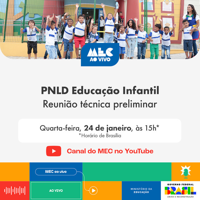 O Ministério da Educação (MEC) realizará uma reunião técnica preliminar sobre o Programa Nacional do Livro e do Material Didático (PNLD) na próxima quarta-feira, 24 de janeiro, para dar início às tratativas do Edital do PNLD Educação Infantil 2026. O encontro virtual acontecerá às 15h e será transmitido ao vivo pelo canal oficial do MEC no YouTube.