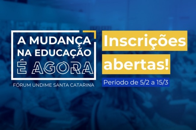 A União dos Dirigentes Municipais de Educação de Santa Catarina (Undime/SC) está com inscrições abertas para o Fórum Undime/SC. O evento traz como eixo central das discussões o lema “A Mudança na Educação é AGORA!”, temática que norteará os conteúdos programáticos desta edição, que será realizada nos dias 19, 20 e 21 de março, em Florianópolis/SC.