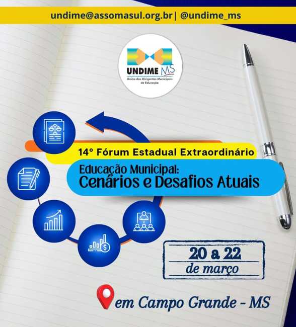 A capital Campo Grande irá sediar o 14º Fórum Estadual Extraordinário da Undime seccional Mato Grosso do Sul. O evento será realizado de 20 a 22 de março de 2024 no auditório da Associação dos Municípios do Mato Grosso do Sul (Assomasul), situado à Av. Eduardo Elias Zahran, 3.179, no bairro Antônio Vendas.
