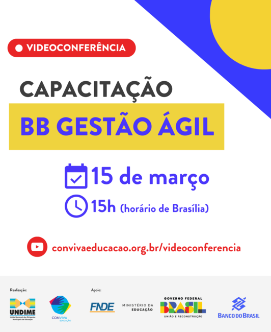Nesta sexta-feira, 15 de março, às 15h (horário de Brasília), a Undime, por meio da plataforma Conviva Educação, vai realizar videoconferência sobre o BB Gestão Ágil, que é uma solução que reúne, em um único ambiente, as informações de recursos creditados e gastos, aplicações financeiras, documentos de despesas relacionados, categorizações dos gastos e todas as contas relativas a um beneficiário, simplificando a gestão dos recursos oriundos de repasses.