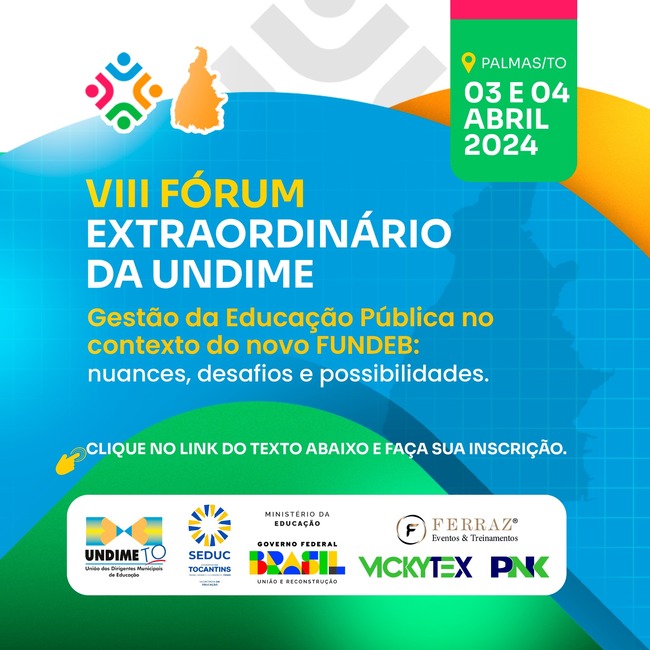 Promovido pela União de Dirigentes Municipais de Educação do Tocantins (Undime-TO) o Fórum Extraordinário será realizado no auditório Crescer da Igreja Sibapa, na Quadra 208 Sul, Alameda 17, 74 - Plano Diretor Sul, em Palmas. O Fórum tem como objetivo discutir as nuances e mudanças do Fundeb permanente quanto a gestão da educação, destacando os desafios e possibilidades.