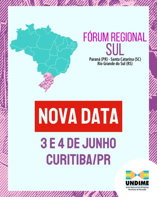 Por motivos de força maior, no sentido de atender demandas locais, o Fórum Regional Sul da Undime, que seria realizado nos dias 15 e 16 de abril, foi adiado para os dias 3 e 4 de junho de 2024. O local permanece o mesmo, no Teatro UP Experience, em Curitiba/PR. Na ocasião, o município vai receber Dirigentes Municipais de Educação, técnicos das secretarias e prefeitos dos municípios de Santa Catarina, Rio Grande do Sul e Paraná.