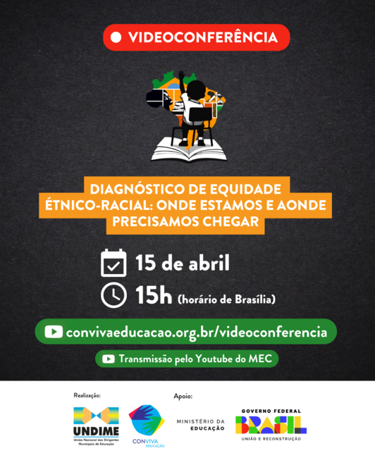 Na próxima segunda-feira, 15 de abril, a Undime e o Ministério da Educação realizam videoconferência com o tema "Diagnóstico de Equidade Étnico-Racial: onde estamos e aonde precisamos chegar". A transmissão ao vivo será pela plataforma Conviva Educação, às 15h (horário de Brasília), com retransmissão pelo canal do MEC no YouTube.