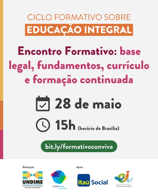 Na próxima terça-feira, 28 de maio, a Undime, por meio da plataforma Conviva Educação, em parceria com o Itaú Social e o Centro de Referências em Educação Integral, realizará o Encontro Formativo com a temática “Educação Integral: base legal, fundamentos, currículo e formação continuada” pelo Google Meet, com limite de 500 participantes. A atividade está marcada para iniciar às 15h (horário de Brasília).