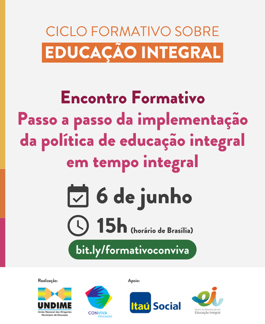 A Undime vai realizar, por meio da plataforma Conviva Educação, em parceria com o Itaú Social e o Centro de Referências em Educação Integral, um Encontro Formativo com a temática “Passo a passo da implementação da política de educação integral em tempo integral” pelo Google Meet, com limite de 500 participantes.