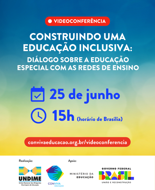 Nesta terça-feira, 25 de junho, a Undime, por meio da plataforma Conviva Educação, realizará videoconferência, com o apoio do Ministério da Educação (MEC), a partir do tema "Construindo uma Educação Inclusiva: diálogo sobre a Educação Especial com as redes de ensino". A transmissão está marcada para 15h (horário de Brasília).