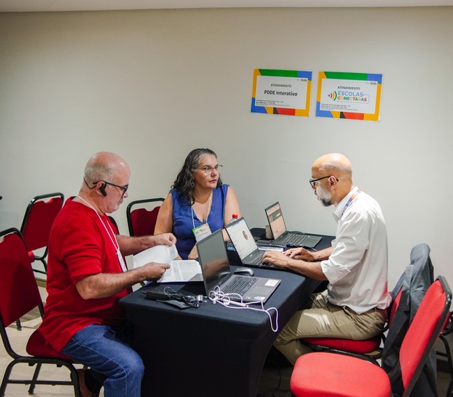 Os profissionais tiram dúvidas e dão informações aos participantes que podem conversar com o MEC e FNDE sobre programas e iniciativas como o Escolas conectadas, o Plano de Ações Articuladas (PAR) e o planejamento 2024 e o PDDE Interativo. O atendimento é fácil e simples.