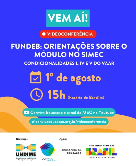No dia 1º de agosto, a Undime com apoio do Ministério da Educação realizará videoconferência para falar sobre o módulo Fundeb no Simec. O objetivo é trazer orientações aos dirigentes municipais de educação para que possam preencher as informações e inserir os documentos relacionados ao atendimento das condicionalidades I, IV e V do VAAR/Fundeb, dispostas na Lei nº 14.113/2020.
