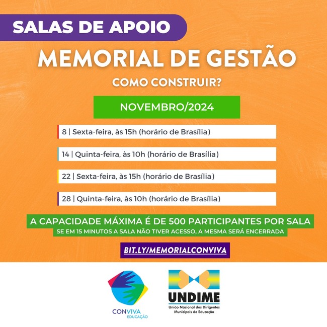 Com o objetivo de apoiar os dirigentes municipais de educação e equipes técnicas na elaboração do Memorial de Gestão, o Conviva realizará uma rodada de encontros virtuais ao longo dos meses de novembro e dezembro de 2024. Ao todo, serão oito encontros intitulados de Salas de Apoio para tratar sobre a construção do documento que as Secretarias de Educação devem fazer com informações sobre as ações realizadas durante a gestão para que sejam conhecidas pelos novos profissionais que vão assumir em 2025, garantindo continuidade das políticas educacionais.