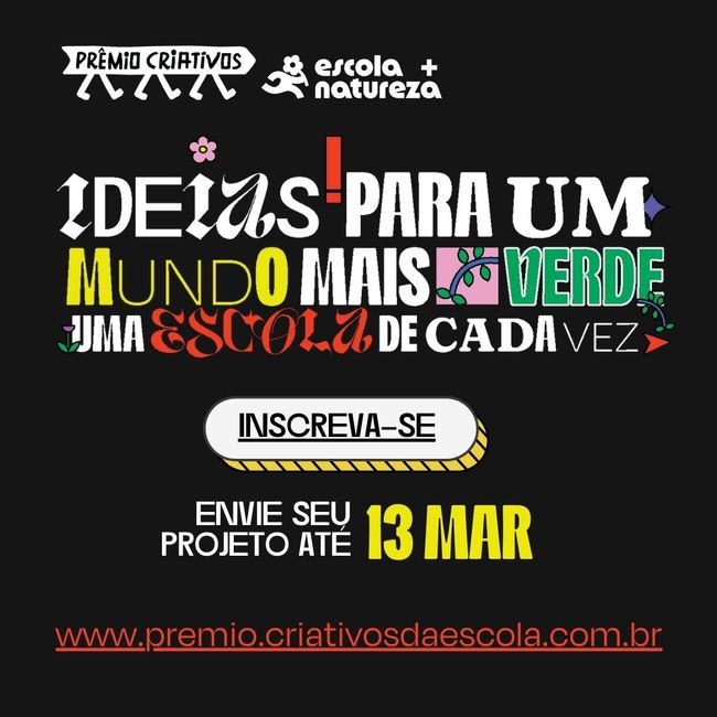 O Instituto Alana prorrogou as inscrições para o Prêmio Criativos Escola + Natureza até o dia 13 de março de 2025. A premiação, promovida pelo programa Criativos da Escola, busca reconhecer projetos desenvolvidos por adolescentes com idades entre 13 e 17 anos que, com o auxílio de educadores e/ou familiares, criam soluções práticas para promover a natureza dentro e fora das escolas. Com a prorrogação, os interessados têm mais tempo para submeter suas iniciativas que já estão sendo realizadas e concorrer a R$ 12 mil.