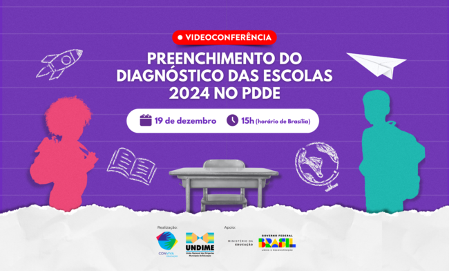 O Diagnóstico das Escolas estará disponível para preenchimento até 5 de janeiro de 2025. Para tirar dúvidas sobre o assunto, nesta quinta-feira, 19 de dezembro, às 15h (horário de Brasília) o Conviva Educação vai realizar a videoconferência "Preenchimento do Diagnóstico das Escolas 2024 no PDDE". A transmissão será na plataforma Conviva Educação e no Youtube do MEC.
