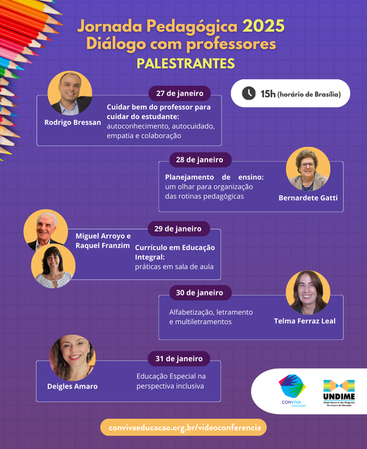 Começa nesta segunda-feira, 27 de janeiro e vai até a sexta-feira, 31 de janeiro a Jornada Pedagógica 2025: diálogo com professores. Realizada pela Undime, a iniciativa proporcionará cinco dias de debates virtuais voltados para professores sobre assuntos relevantes para o contexto da prática educacional.