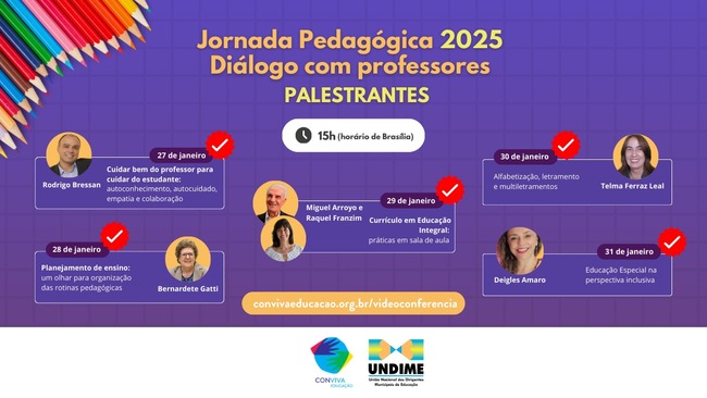 A Undime promoveu a Jornada Pedagógica 2025: diálogo com professores, de 27 a 31 de janeiro, por meio do canal do Conviva Educação no YouTube. Ao todo foram cinco dias de debates sobre assuntos relevantes para o contexto da educação no âmbito municipal. A programação contemplou discussões de assuntos como autoconhecimento, autocuidado, empatia e colaboração; planejamento de ensino; currículo em Educação integral; alfabetização, letramento e multiletramentos; e Educação Especial na perspectiva inclusiva.
