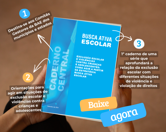A publicação foi apresentada em primeira mão, no final de 2024, no encontro com coordenadores(as) operacionais da BAE nos estados e coordenadores(as) institucionais da Undime, em Brasília. De acordo com o UNICEF, esse é o primeiro de uma série de cadernos que aprofundarão a relação da exclusão escolar com diferentes situações de violência e violação de direitos contra crianças e adolescentes. Eles irão ajudar a melhor caracterizar, identificar e conduzir os casos de exclusão e abandono escolar relacionados às violências, organizando os fluxos de atendimento por meio das políticas públicas existentes.