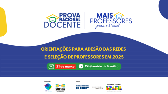 A videoconferência Prova Nacional Docente: orientações para adesão das redes e seleção de professores em 2025, prevista para ser realizada hoje, 20 de março, será remarcada para amanhã, sexta-feira, 21 de março.
