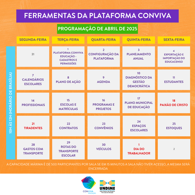 Cada sala tem capacidade máxima de 500 participantes e os eventos virtuais acontecem de segunda a sexta-feira, das 10h às 12h (horário de Brasília), abordando temas essenciais para a gestão educacional municipal.