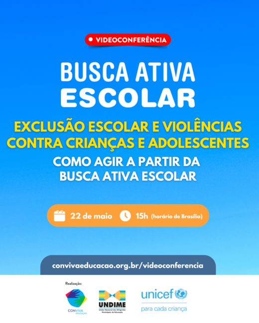 Na quinta-feira, dia 22 de maio, às 15h (horário de Brasília), a Undime e o Fundo das Nações Unidas para a Infância (UNICEF) realizam a videoconferência “Exclusão escolar e violências contra crianças e adolescentes - como agir a partir da Busca Ativa Escolar”. A transmissão ao vivo será realizada por meio do canal do Conviva Educação no YouTube.