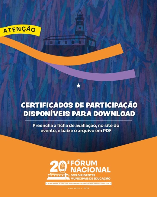 Os participantes do 20º Fórum Nacional dos Dirigentes Municipais de Educação, realizado pela Undime de 27 a 30 de julho de 2025, em Salvador/BA, já podem acessar seus certificados de participação. Para isso, é necessário preencher a ficha de avaliação do evento, disponível no sistema.