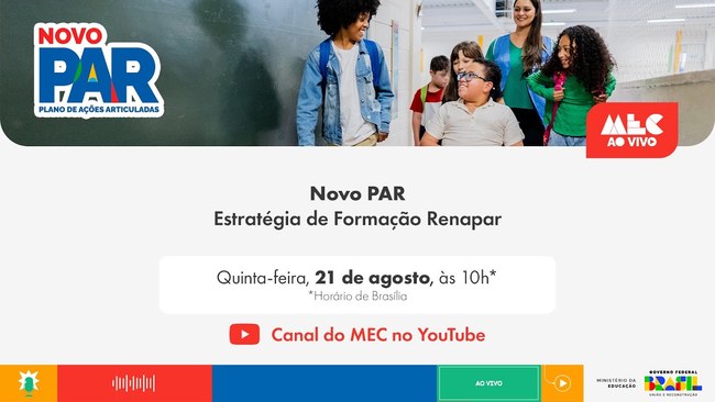 O Ministério da Educação (MEC) realizará, na quinta-feira, 21 de agosto, às 10h (horário de Brasília), um webinário para apresentar a estratégia de assistência técnica e formação para a etapa de planejamento do Novo Plano de Ação Articulada (Novo PAR). O evento é voltado para articuladores da Rede de Formação e Assistência Técnica do Novo PAR (Renapar) e secretarias municipais e estaduais de educação. O encontro será transmitido ao vivo pelo canal do MEC no YouTube.