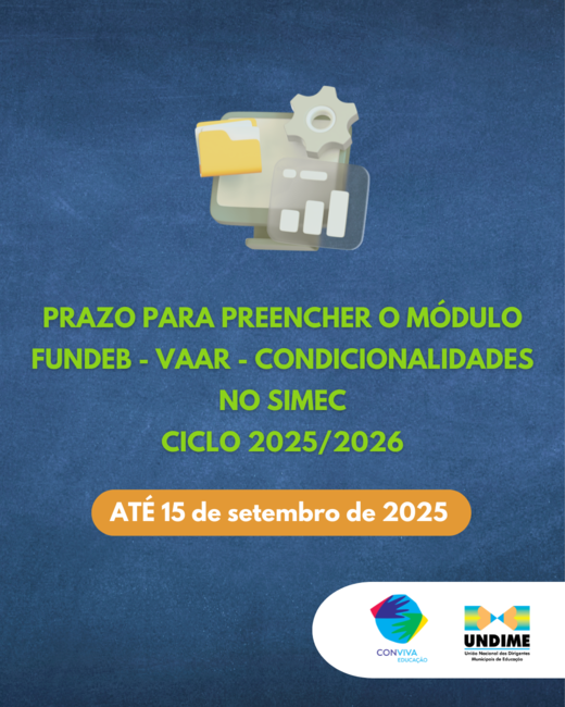 O preenchimento do módulo “Fundeb – VAAR – Condicionalidades” - Ciclo 2025/2026 deve ser realizado no Sistema Integrado de Monitoramento, Execução e Controle (Simec), pode ser realizado pelas equipes técnicas e deve ser enviado por todos os secretários municipais e estaduais de educação. A comprovação do cumprimento das condicionalidades é obrigatória para o recebimento de recursos da complementação-VAAR.