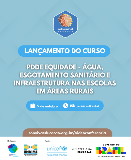 Nesta quinta-feira, 9 de outubro, a Undime, por meio do Conviva Educação, e em parceria com o Ministério da Educação (MEC) e o Unicef Brasil, promove videoconferência de lançamento do curso "PDDE Equidade - Água, Esgotamento Sanitário e Infraestrutura nas escolas em áreas rurais".