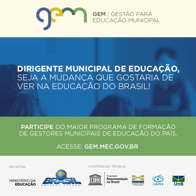 Com o objetivo de apoiar a formação continuada dos dirigentes e técnicos municipais de todo o país no processo de implementação de políticas educacionais, o Ministério da Educação (MEC) lançou o programa Gestão para a Educação Municipal (GEM). Composto de três etapas – aperfeiçoamento, especialização lato sensu em gestão da educação pública e mestrado profissional em gestão da educação municipal – o programa recebe até o dia 16 de abrilinscrições para o Curso GEM de aperfeiçoamento, o primeiro do programa.