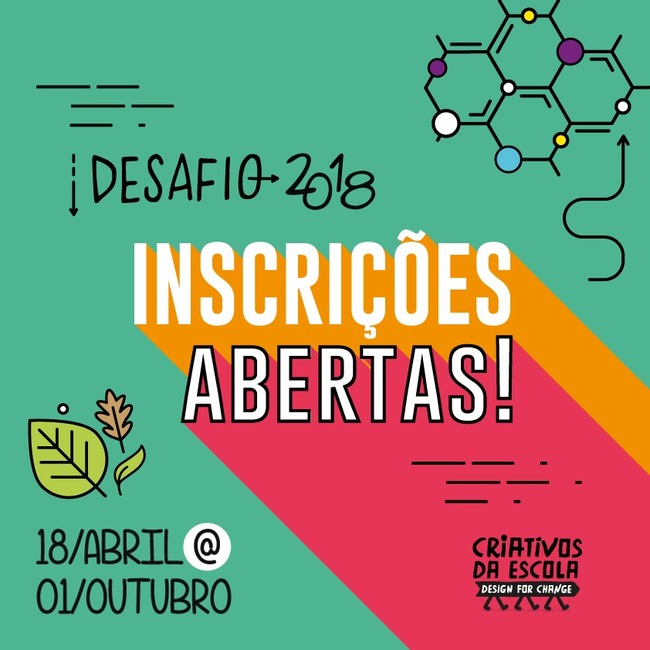 Estudantes e educadores de todo o Brasil, preparem-se: as inscrições para a premiação “Desafio Criativos da Escola 2018” estão abertas a partir desta quarta-feira (18)! Realizado pelo programa Criativos da Escola, do Alana, o Desafio encoraja crianças e adolescentes, alunos do ensino fundamental ou médio, a protagonizarem histórias de mudanças a partir de problemas que atinjam suas escolas, comunidades ou mesmo municípios onde moram. As inscrições pode ser feitas no site do Criativos da Escola.
