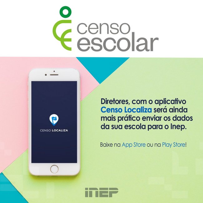 O aplicativo Censo Localiza, lançado pelo Instituto Nacional de Estudos e Pesquisas Educacionais Anísio Teixeira (Inep) para aprimorar a coleta de dados de localização geográfica das escolas no Censo Escolar 2018, já está disponível na Play Store, para celulares Androids, e na App Store, para Iphones. O app deve ser utilizado pelos usuários do Sistema Educacenso, responsáveis pela declaração de suas escolas.
