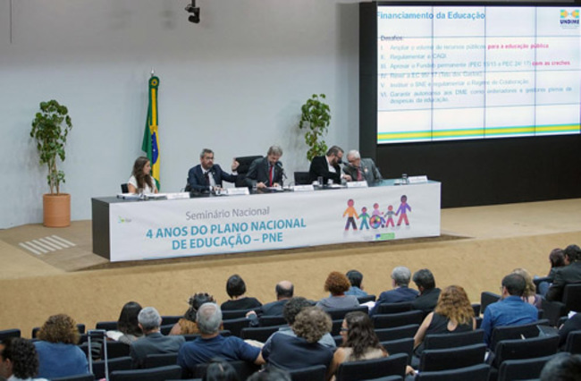 A Comissão de Educação da Câmara e a Frente Parlamentar em Defesa da Implantação do Plano Nacional de Educação (PNE) aprovaram uma carta a ser entregue aos candidatos à Presidência da República para que eles se comprometam a cumprir as metas do plano. O documento foi assinado em seminário para discutir os quatro anos de vigência do PNE.