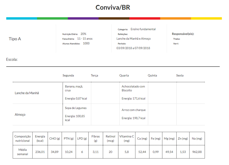 O relatório exibirá as refeições distribuídas ao longo da semana e também uma tabela com a média dos nutrientes. No exemplo acima, o total de nutrientes dos cardápios da semana são somados e divididos por dois, pois nesse caso, as refeições são oferecidas em dois dias.