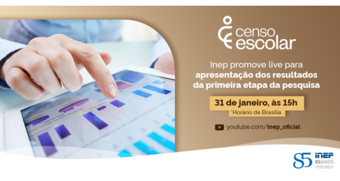 Live de apresentação dos resultados da primeira etapa do Censo Escolar 2021 será segunda-feira, 31 de janeiro, às 15h (horário de Brasília), no canal do Instituto no YouTube