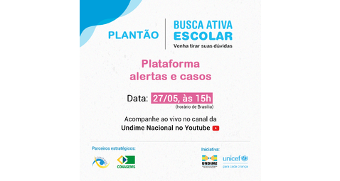 Dia 27/05, quinta-feira, às 15h (horário de Brasília) a Busca Ativa Escolar vai realizar o plantão tira dúvidas sobre o tema Plataforma – alertas e casos. Compartilhe com sua equipe e venha tirar suas...