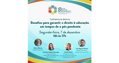 Em dezembro, do dia 7 ao dia 11 de dezembro, a Undime vai realizar 8º Fórum Nacional Extraordinário dos Dirigentes Municipais de Educação. O evento será virtual, em função da pandemia, por meio de videoconf...
