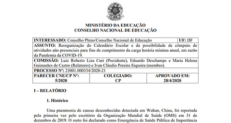 O Conselho Nacional de Educação publicou na tarde de hoje (30) o Parecer nº 5/2020, que dispõe sobre a reorg...