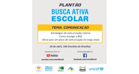 O Plantão Semanal da Busca Ativa Escolar, estratégia desenvolvida pelo UNICEF, Undime, Congemas e Conasems, discute, nesta quarta-feira (10), às 16h (horário de Brasília), estratégias de comunicação.